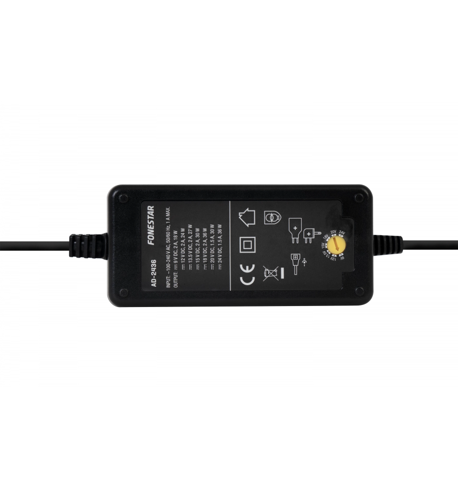 Adaptador CA/CC para aparatos con alimentación de 9 a 24 V y consumo máximo de 2 A, 36 W máximo.