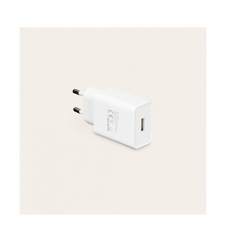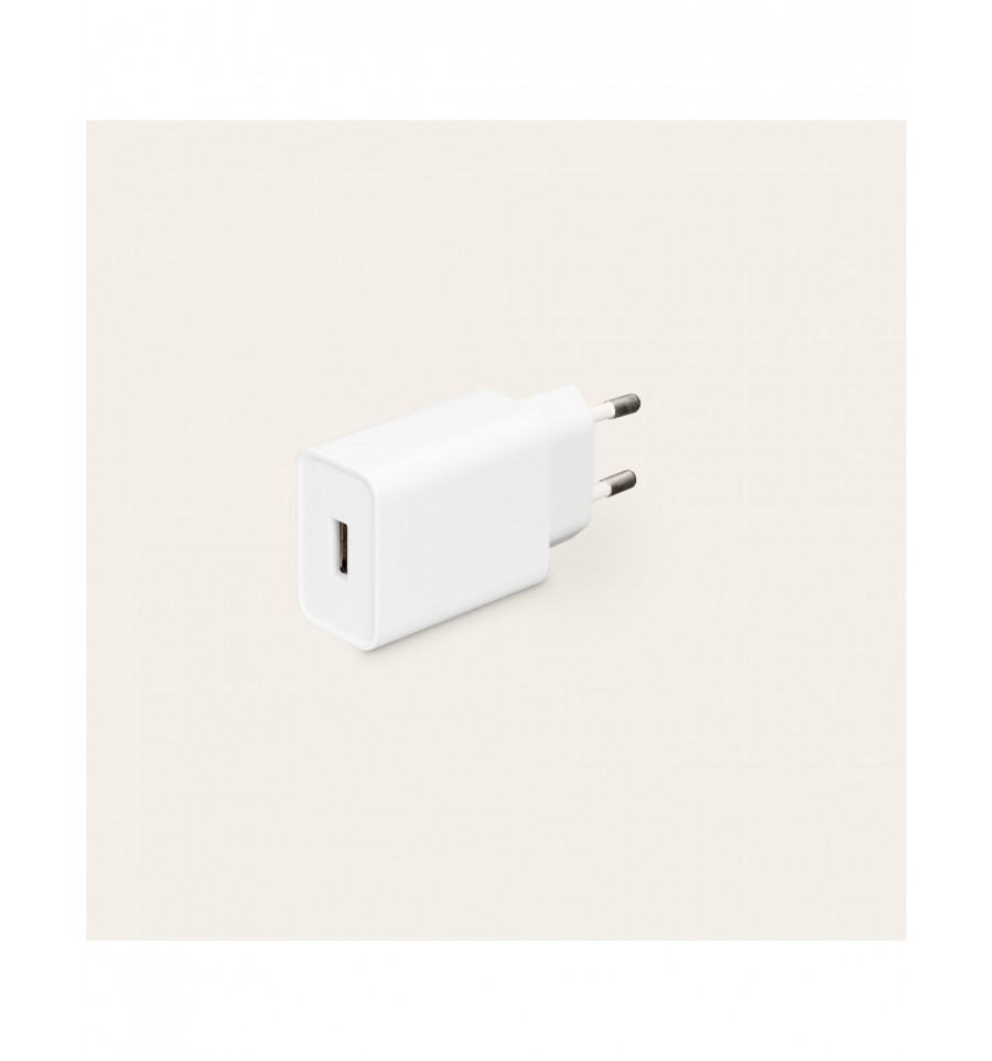Cargador de red con potencia de 5V/2.4A con puerto USB para cargar smartphones y tablets. Color blanco.