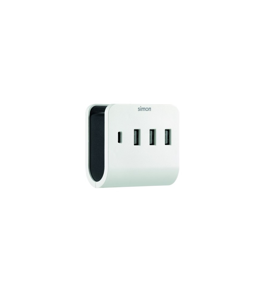 El adaptador con soporte de Simon cuenta con 4 puertos USB de los cuales 3 son USB A y uno es USB C. Los 4 puertos USB cuentan con una potencia máxima de 4,8A. Incluye un soporte en la parte superior para apoyar un smartphone mientras se está cargando la batería del dispositivo. Permite disponer de 4 puertos USB en un mismo punto de carga para optimizar la toma de corriente y poder así cargar distintos dispositivos a la vez.