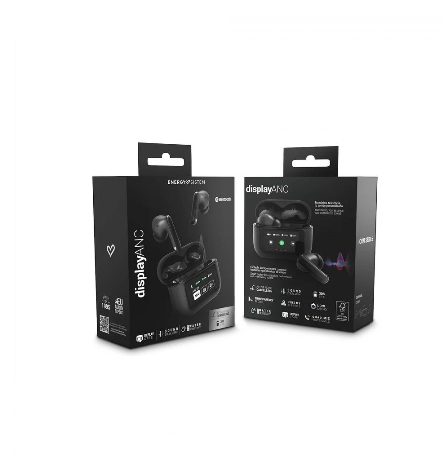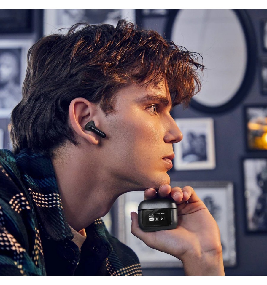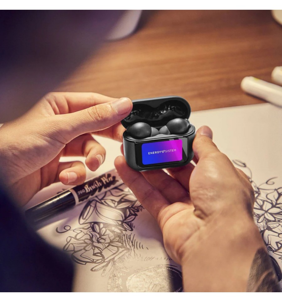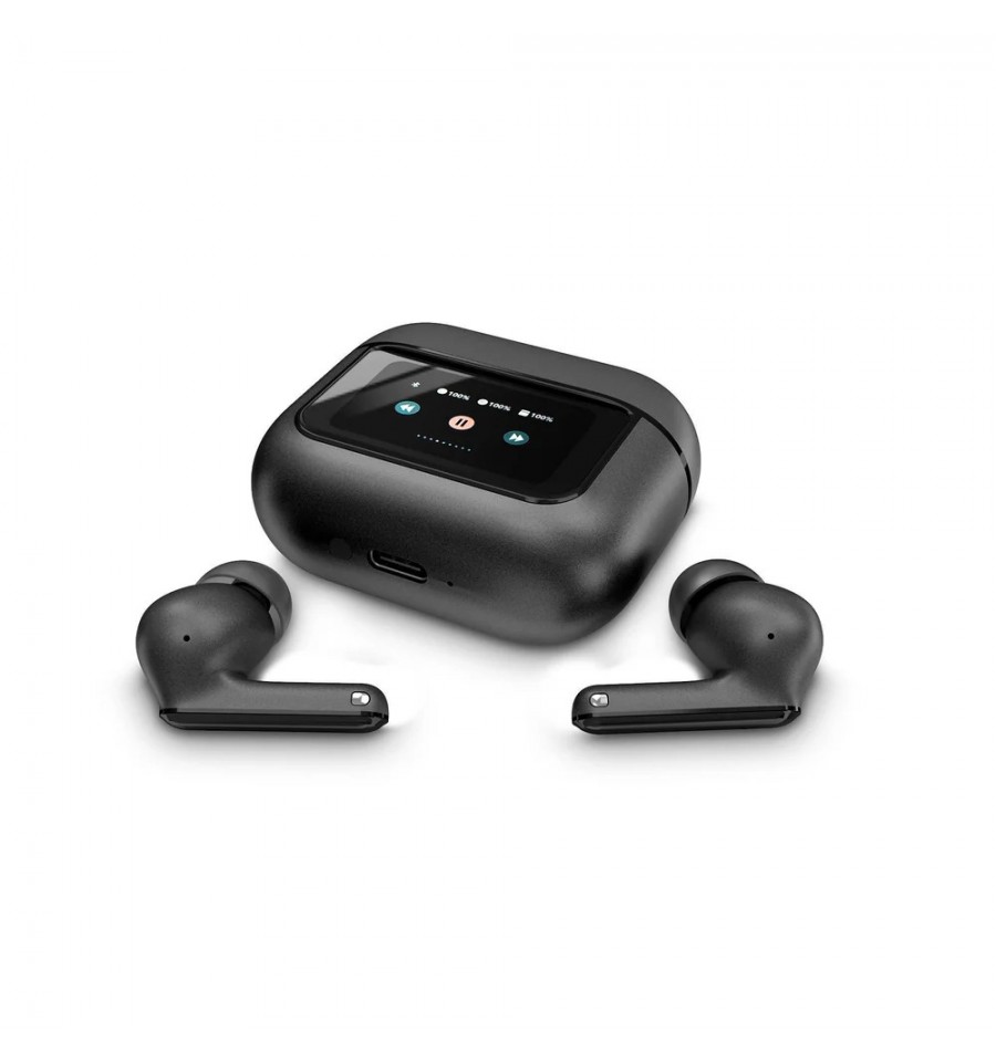 Auriculares True Wireless con pantalla en el estuche de carga.