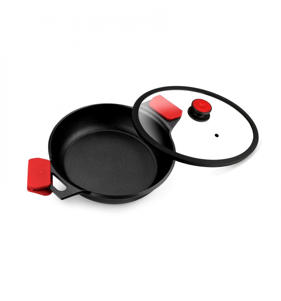 Incluye tapa de cristal. Incluye dos asas de silicona en color rojo para coger la cacerola con comodidad y tapa de cristal con borde de silicona para conseguir un cierre perfecto.