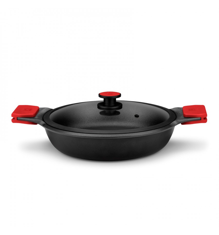 Incluye tapa de cristal.Incluye dos asas de silicona en color rojo para coger la cacerola con comodidad y tapa de cristal con borde de silicona para conseguir un cierre perfecto.
