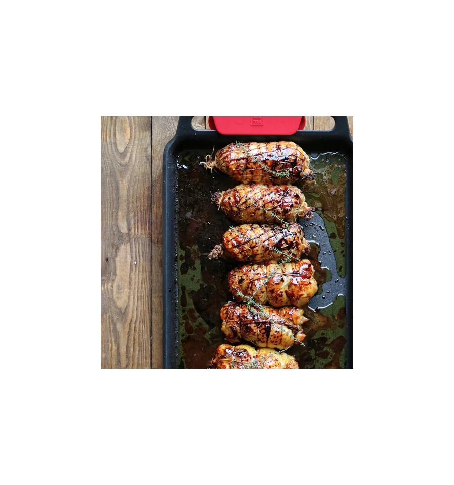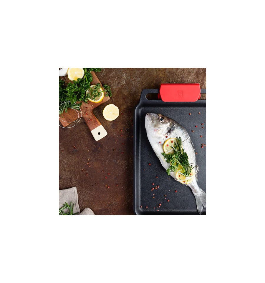 La parrilla lisa Infinity es ideal para cocinar los alimentos, tanto en el fuego como en el horno, de una forma muy sana y sencilla. Su amplio fondo difusor es perfecto para poder cocinar a la vez tanto la carne o el pescado como la guarnición con la que se quiera acompañar. De forma rápida y eficiente, sin apenas grasas y sin que se pegue nada, podrás preparar unas comidas y cenas de lo más deliciosas. Pincelando la parrilla con el aceite habitual o bien con uno aromatizado, podrás darle un punto diferente a la carne o al pescado en cada ocasión. Platos sabrosos y saludables con un toque especial como unas rodajas de rape con unos espárragos verdes y un poco de aceite de gambas, un entrecot de ternera con las setas que prefieras y aceite de trufa o de boletus, una parrillada de verduras variadas con aceite de ajo, unos calamares con unas láminas de calabacín con aceite de oliva o unos mejillones abiertos en el grill con un poco de pimienta. Su superficie lisa te permite utilizarlo incluso como bandeja para hornear tartas de hojaldre, galletas, pizzas, empanadas o una focaccia de lo más apetitosa. Recetas sanas y deliciosas, cocinadas de forma muy eficiente en una parrilla muy versátil, robusta y duradera que además se limpia muy fácilmente.