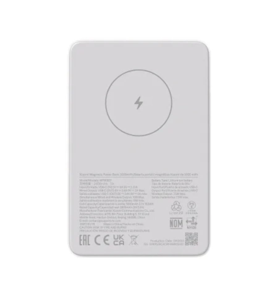 Xiaomi WPB0507. Capacidad de batería: 5000 mAh, Tecnología de batería: Ión de litio. Número de puertos USB Tipo C: 1. Cargador inalámbrico. Color del producto: Blanco