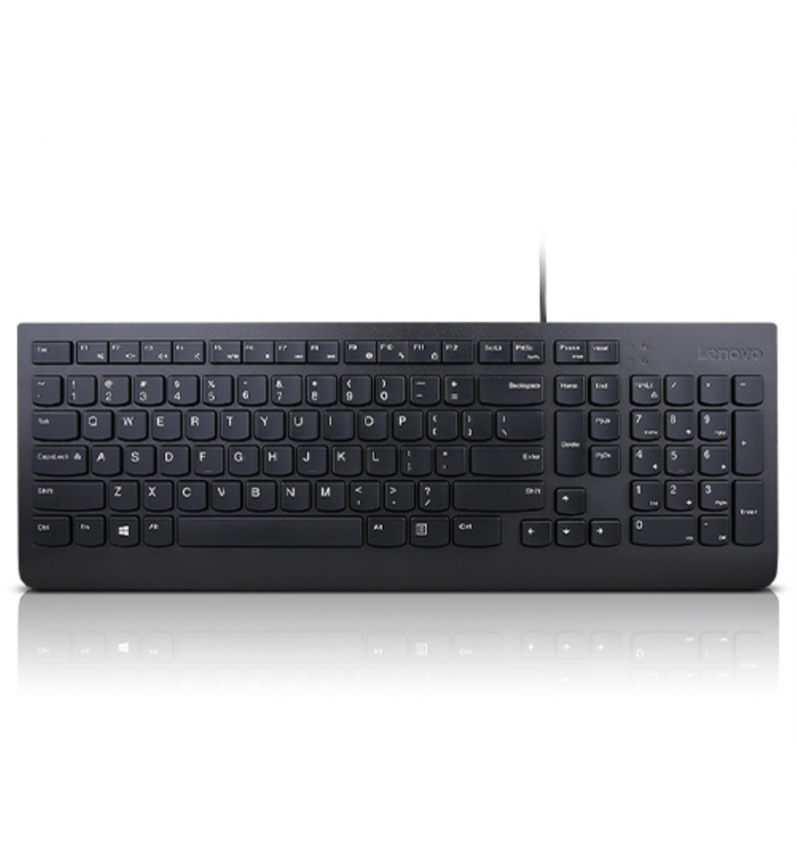 Lenovo Essential. Formato del teclado: Completo (100%). Estilo de teclado: Derecho. Tecnología de conectividad: Alámbrico, Interfaz del dispositivo: USB, Interruptor del teclado: Interruptor de membrana, Diseño de teclado: QWERTY. Longitud de cable: 1,8 m. Uso recomendado: Universal. Color del producto: Negro