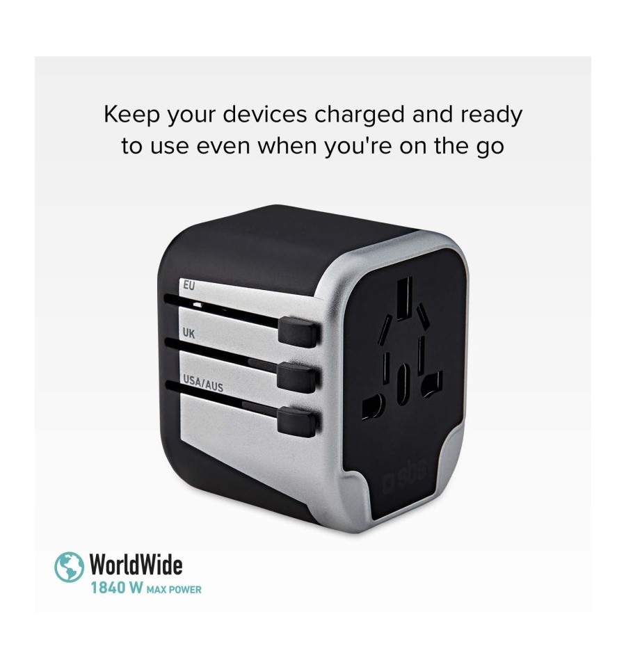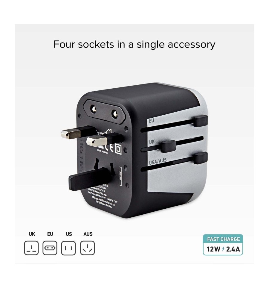 Una solución única de carga para todos tus viajes por el mundo.Gracias a este adaptador universal será posible tener tus dispositivos cargados allá donde te encuentres: smartphone, tableta, batería externa, cámara digital, bases para auriculares, etc.