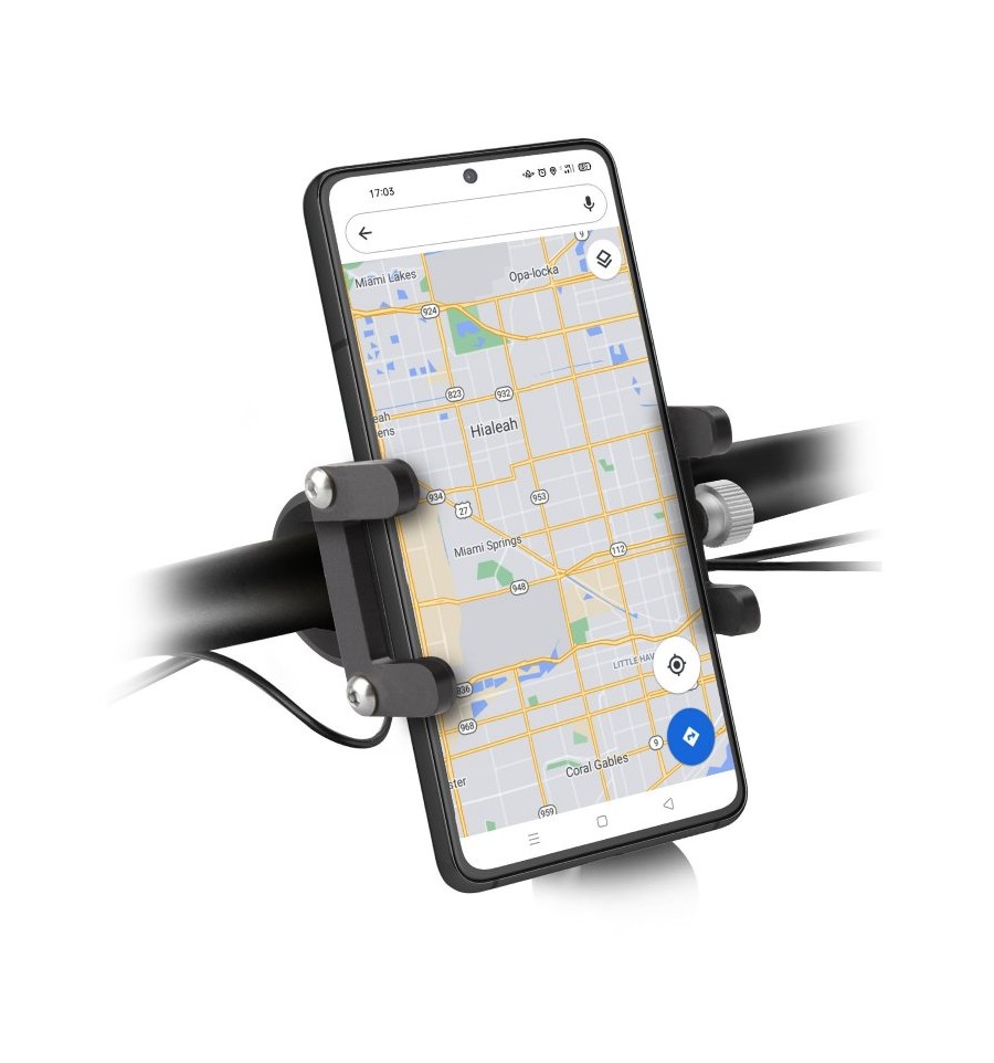 Este soporte para móvil te ofrece la posibilidad de mantener el teléfono bien fijado sobre el manillar de tu patinete o de tu bici. La mordaza de aluminio asegura una sujeción estable de tu "smartphone", Apple, Samsung, Huawei, Xiaomi, entre otras marcas, sin dañarlo gracias a sus prácticas piezas de goma de protección. Tanto sobre caminos, carreteras sin pavimentar o adoquines urbanos, el dispositivo permanecerá siempre bien sujeto.